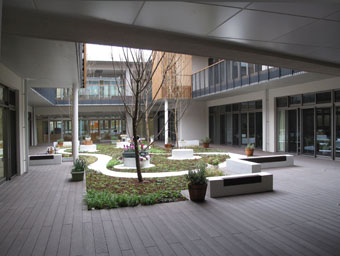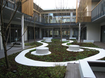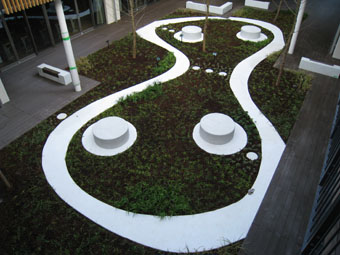 山手中学校 ∞の形にも似た「リボン」。園路と言えば園路。オブジェと言えばオブジェ。 中庭に面して向かい合う教室。それらを有機的に結びつける「リボン」。 生徒たちのコミュニケーションを飾り付ける「リボン」になることを願います。